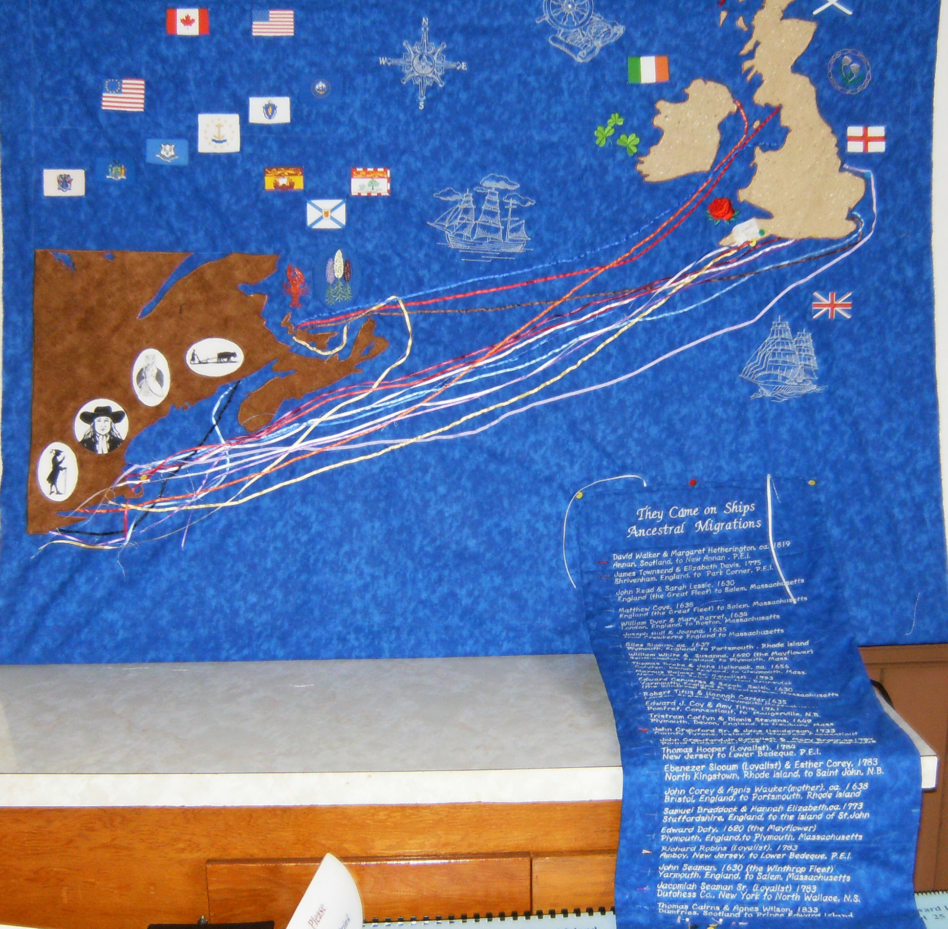 This year's major embroidery/quilt project. It represents migrations of David's various ancestors. David is providing the layout, while Suzan's creative skills are putting it all together.