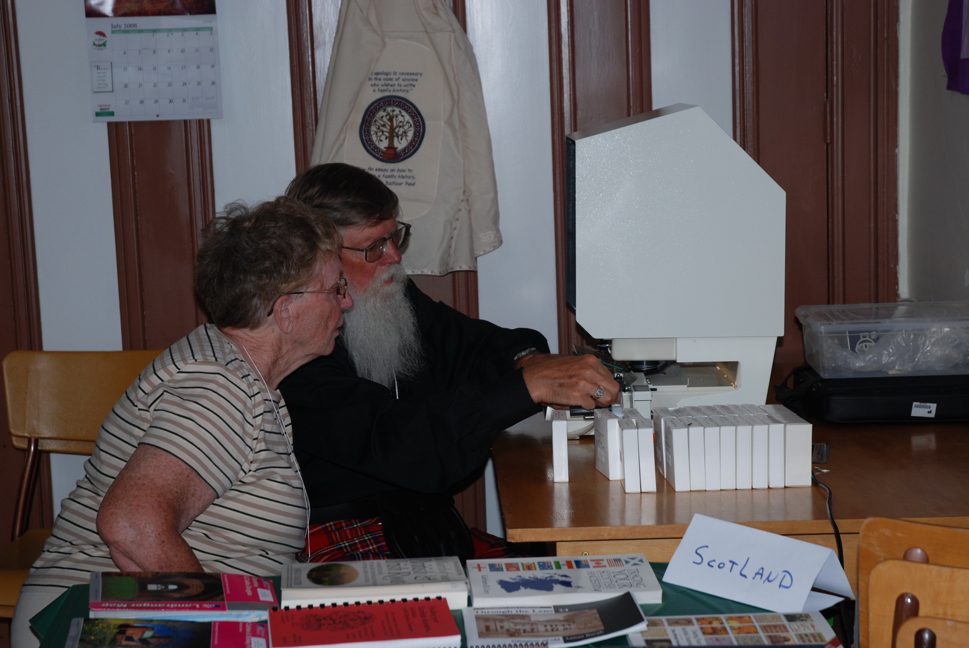 David assisting Marilyn (Clay) Adair at the microfilm reader.