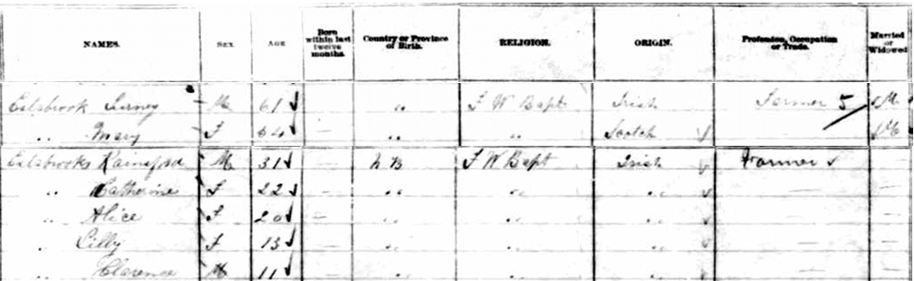| Witness | He was enumerated on the census in 1881 in the household of Turney Estabrooks in Burton, Sunbury County, New Brunswick, CanadaG. included in the household with Turney (age 61) were his second wife Mary Logan (age 54), children Rainsford (age 31), Catherine (age 22), Alice (age 20), Lilly (age 13) and Clarence (age 11). Turney and Rainsford were farmers. The family religon was Free Will Baptist.2 1881 Canada Census, Burton, Sunbury County, New Brunswick. Household of Turney Estabrooks, his second wife Mary Logan, their children Rainsford, Catherine, Alice, Lillian and Clarence. |