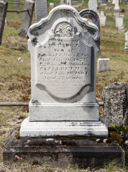Inscription: In Memory of / David J. Coy / Son of / Samuel & Mary J. Coy / died Jan. 16, 1873, /Æ. 20 yrs. also their dau. / Elizabeth A. / died Jan. 16, 1864, / Aged 22 years. / Text.2  Marker, David J. Coy (1853-1873), his sister Elizabeth A. Coy (1842-1864). Upper Gagetown Cemetery, Upper Gagetown, Queens County, New Brunswick, Canada.