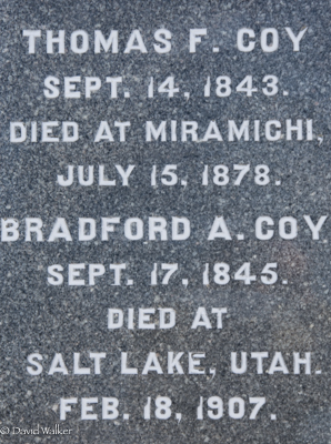 Back: Thomas F. Coy / Sept. 14, 1843 / Died at Miramichi / July 15, 1878 / Bradford A. Coy / Sept. 17, 1845 / Died at / Salt Lake, Utah, / Feb. 18, 1907.2  Marker, Samuel Coy (1803-1882), his first wife Mary Jane Currey (1810-1861), his second wife Ruth Amelia Estey (1824-1881), children by his first marriage, Elizabeth A. (1841-1864), David J. (1853-1873), Maria Clayton (1830-1882), Charles J. (1847-1854), Adelaide A. (1851-1854), Eunice P. (1833-1858), George A. (1837-1860), Louisa Currey (1835-1860), Thomas F. (1843-1878) and Bradford A. (1845-1907). Upper Gagetown Cemetery, Upper Gagetown, Queens County, New Brunswick, Canada.  Front inscription detail.  Left inscription detail.  Right inscription detail.  Back inscription detail.
