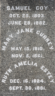 Inscription: Front: Samuel Coy / Oct. 25, 1803, / June 28, 1882. / Mary Jane Currey / May 15, 1810. / Nov. 5, 1861 / Ruth Amelia Estey / Dec. 16, 1824, / Sept. 30, 1881 / COY
