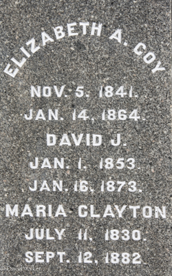 Left: Elizabeth A. Coy / Nov. 5, 1841. / Jan. 14, 1864 / David J. / Jan. 1, 1853. / Jan. 16, 1873 / Maria Clayton / July 11, 1830. / Sept. 12, 1882