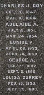 Right: Charles J. Coy / Oct. 28, 1847. / Mar. 18, 1854 / Adelaide A. / July 4, 1851 / Mar. 24, 1854. / Eunice P. / April 28, 1833 / April 14, 1858 / George A. / Feb. 27, 1837 / Sept. 3, 1860 / Louisa Currey / Feb. 19, 1835. / Sept. 29, 1860