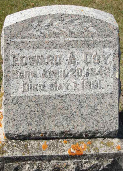 | Burial | He was buried in Grenfell Cemetery; Melville Census Division, Grenfell, Saskatchewan, Canada, 50.412871, -102.929992G. Plot: Section 7, block 58, plot A. Inscription: Edward A. Coy / Born April 20, 1843 / Died May 1, 1901.3 ![]() Tombstone, Edward A. Coy (1843-1901). Grenfell Cemetery, Grenfell, Saskastchewan, Canada. Photo courtesy of findagrave.com, memorial #42734650. |