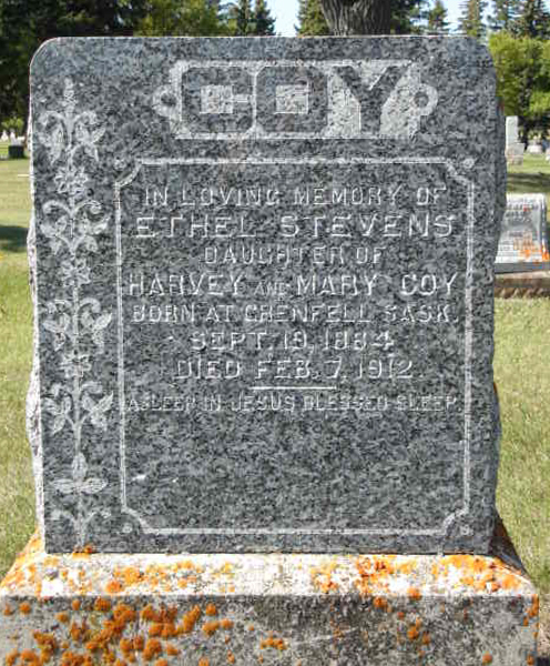 | Burial | She was buried in Grenfell Cemetery; Land location Nw W Sec 33 T 16 R 7 W 2, Grenfell, Saskatchewan, CanadaG. Inscription: COY / In Loving Memory of / Ethel Stevens / Daughter of / Harvey and Mary Coy / Born at Grenfell, Sask. / Sept. 19, 1884 / Died Feb. 7, 1912 / -- / Asleep in Jesus Blessed Sleep.2 ![]() Tombstone, Ethel Stevens Coy (1885-1912). Grenfell Cemetery, Grenfell, Saskastchewan, Canada. Photo courtesy of findagrave.com, memorial #427334423. |