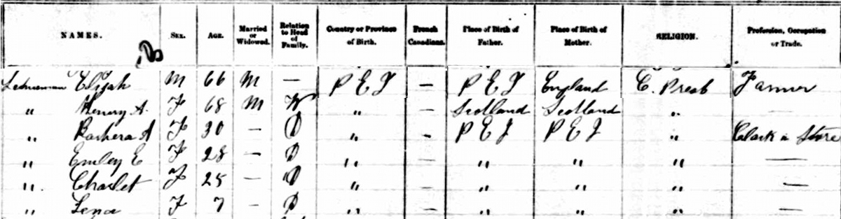 | Daughter | She was enumerated on the census on 28 April 1891 in the household of Elijah Hyatt Schurman, as a daughter, in Lot 17, Prince County, Prince Edward Island, CanadaG. Enumerated in the household with Elijah (age 66) were his wife, Henriann Walker (age 68), their children, Barbara (age 30), Emily (age 28), Charlotte (age 25), Lena (age 7), and grandchildren Sydney (age 15) and Arthur (age 11), their mother Margaret is now deceased. Elijah was a farmer, Barbara was a store clerk. The family religion was Presbyterian.7![]() 1891 Canada Census, Lot 17, Prince County, Prince Edward Island. Household of Elijah Hyatt Schurman, his wife Henriann (Walker), their children, Barbara, Emily, Charlotte, Lena, and grandchildren Ardney and Arthur, sons of Margaret, now deceased. |
