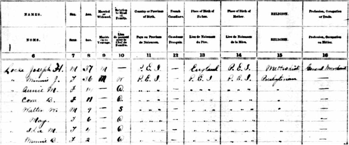 | Wife | She was enumerated on the census in 1891 in the household of James Marchbank, Jr., as his wife, in Lot 19, Prince County, Prince Edward Island, CanadaG. Enumerated in the household with James were his wife Jane, sons Robert, Percy and James, daughters Mary, Clara, Grace, Jenny, Lucy and Emeline. James was listed as a farmer, born on Prince Edward Island. All were listed as being Presbyterian. The house was described as wooden, 1.5 stories and 8 rooms.9 |