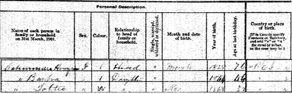 | Daughter | She was enumerated on the census in 1901 in the household of Henriann Walker, as a daughter, in Summerside, Prince County, Prince Edward Island, CanadaG. Enumerated in the household with Henriann (age 76) were her daughters, Barbara (age 46) and Lottie/Charlotte (age 32).3![]() 1901 Canada Census, Summerside, Prince County, Prince Edward Island. Household of widow Henriann (Walker) Schurman and her single daughters, Barbara and Lottie (Charlotte). |