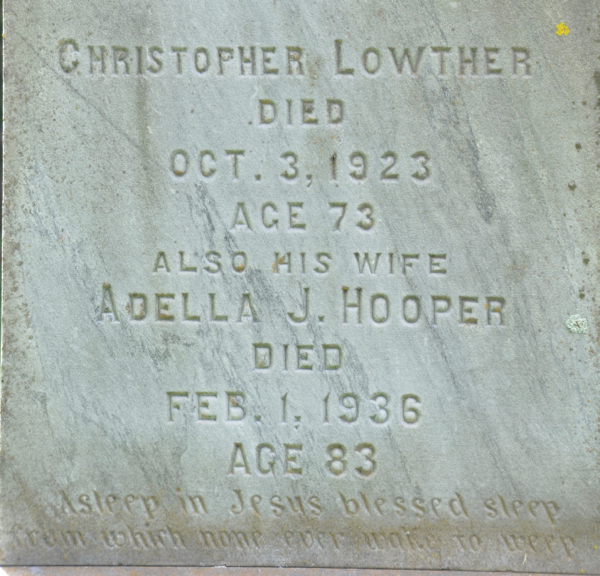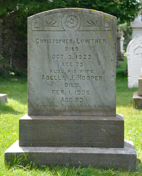 | Interred | She was buried in the plot of Christopher Lowther, in the United Church Cemetery, Searletown, Prince County, Prince Edward Island, Canada, 46.30268, -63.68974G. Inscription: Christopher Lowther / Died / Oct. 3, 1923 / Age 73 / Also His Wife / Adella J. Hooper / Died / Feb 1, 1936 / Age 83 / Asleep in Jesus blessed sleep / from which none ever wake to weep / LOWTHER.12 ![]() Tombstone, Christopher Lowther (1852-1923), his wife Adella Jane Hooper (1853-1936). United Church Cemetery, Searletown, Prince County, Prince Edward Island, Canada. ![]() Front inscription detail. |