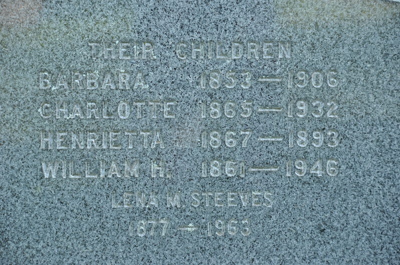 | Interred | She was buried in the plot of Elijah Hyatt Schurman, in the Peoples Cemetery, Summerside, Prince County, Prince Edward Island, Canada, 46.40518, -63.77657G. Inscription: Schurman / Elija Schurman / 1823-1895 / His wife / Henriann Walker / 1823-1919.Back: Their children / Barbara 1853-1906 / Charlotte / 1865-1932 / Henrietta 1867-1893 / William H. 1861-1946 / Lena M. Steeves / 1877-1963.2 ![]() Tombstone, Elijah Hyatt Schurman (1825-1897), his wife Henriann Walker (1823-1919), their children Barbara (1853-1906), Charlotte (1865-1932), Henrietta (1867-1893), William H. (1861-1946) and Lena Maude (1877-1963). Peoples Cemetery, Summerside, Prince Edward Island, Canada. ![]() Back inscription detail. |