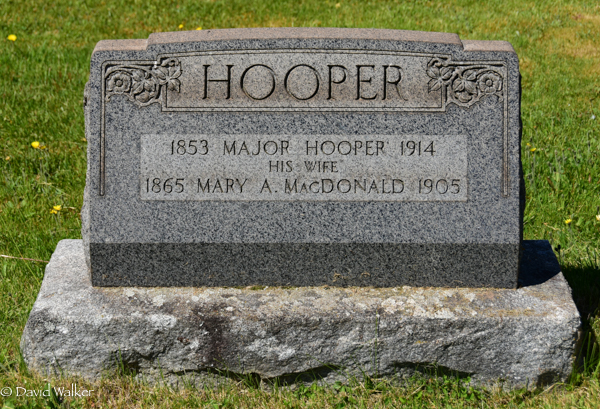| Burial | He was buried in the Church of Scotland Cemetery, Cape Traverse, Prince County, Prince Edward Island, Canada, 46.23865, -63.63129G. Inscription: HOOPER / 1853 Major Hooper 1914 / His Wife / 1865 Mary A. MacDonald 1905.Back: Daughter / 1889 Millicent 1911 / Sons / 1894 Norman 1929 / 1899 Robert 1961.2 ![]() Tombstone, Major Hooper (1853-1975), his wife, Mary A. MacDonald (1865-1905), their children, Millicent (1889-1911), Norman (1894-1929), Robert (1899-1961). Church of Scotland Cemetery, Cape Traverse, Prince County, Prince Edward Island. ![]() Detail of inscription on back. |
