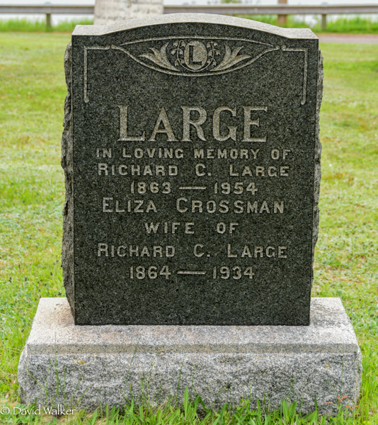 | Burial | He was buried in the Peoples Cemetery, Tryon, Prince County, Prince Edward Island, Canada, 46.23893, -63.54364G. Inscription: LARGE / In Loving Memory of / Richard C. Large / 1863 - 1954 / Eliza Crossman / Wife of / Richard C. Large / 1864 - 1934.9 ![]() Tombstone, Richard Large (1863-1954), his wife Eliza Crossman (1864-1934). United Church Cemetery,Tryon, Prince County, Prince Edward Island, Canada. |
