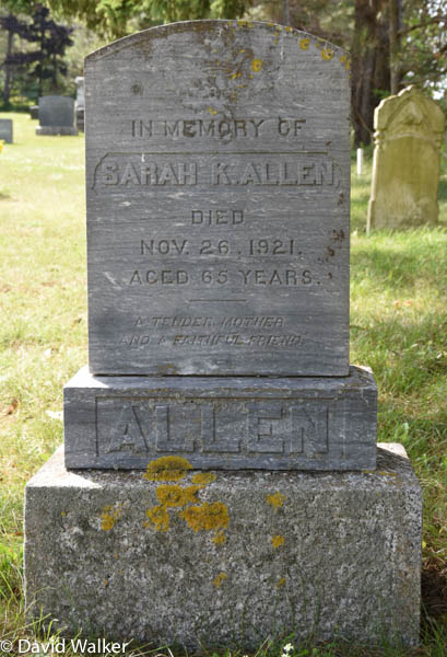 | Marriage | She married James Edward C. Allen on 8 April 1886, James a bachelor living in North Carleton, Prince County, Sarah was a spinster also living in North Carleton.6 |