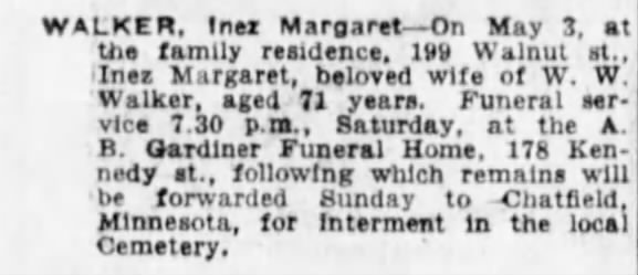 | Death | She died on 3 May 1940 in Winnipeg, Manitoba, CanadaG, Obituary: "There passed away in Winnipeg, Manitoba on May 3rd Inez wife of Warburton W. Walker. Mr. Walker is a brother of Mrs. Hammond W. Cannon of this town."9,5![]() Obituary for Inez Margaret (McGrew) Walker. The Winnipeg Tribune. |