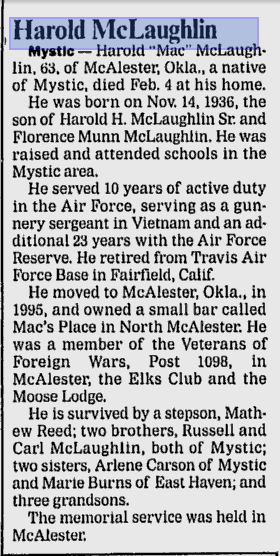 | Death | He died on 4 February 2000 in home, McAlester, Pittsburgh County, Oklahoma, USAG.2 Obituary, Harold McLaughlin Jr. |