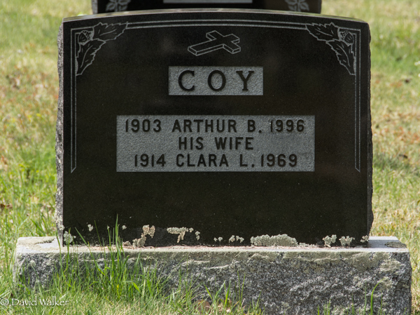 Inscription: COY / 1903 Arthur B. 1996 / His Wife / 1914 Clara L. 1969.2  Tombstone, Arthur B. Coy (1903-1996), his wife Clara L. Merritt (1914-1969). Upper Gagetown (Baptist) Cemetery, Queens County, New Brunswick, Canada.