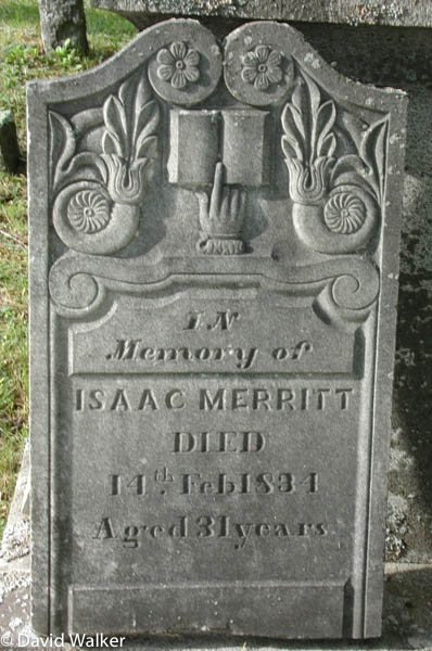 Inscription: In / Memory of / Isaac Merritt / Died / 14th Feb. 1834 / Aged 31 years.1  Tombstone, Isaac Merritt (1802-1834). Merritt and Slipp Cemetery, Queenstown, Queens County, New Brunswick, Canada.