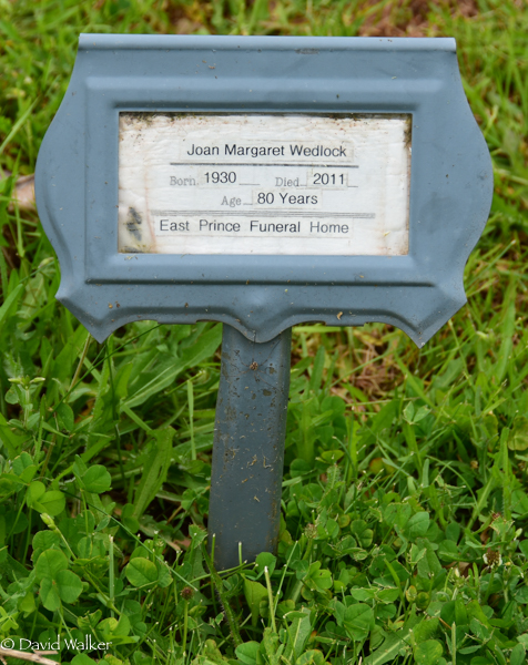 | Burial | She was buried in the Peoples Cemetery, Summerside, Prince County, Prince Edward Island, Canada, 46.40479, -63.77476G. Funeral Home Stake.Inscription: Joan Margaret Wedlock / Born 1930 - Died 2011 / Age 80 Years / East Prince Funeral Home.5 ![]() Funeral Home Stake, Joan Margaret Wedlock (1930-2011). Peoples Cemetery, Summerside, Prince County, Prince Edward Island, Canada. |