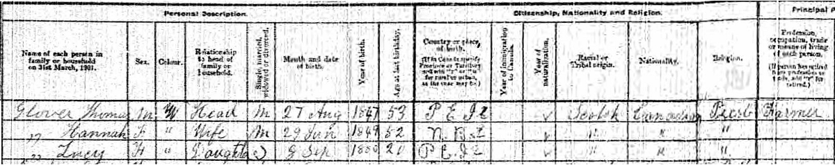 | Census | Thomas Cairns Glover was head of the household in the census in 1901 in Summerside, Prince County, Prince Edward Island, CanadaG. included in the household with Thomas (age 53) were his wife Hannah (age 52) and their daughter Lucy (age 20). Thomas was a farmer. The family religion was Presbyterian.2 1901 Canada Census, Summerside, Prince County, Prince Edward Island. Household of Thomas Glover, his wife Hannah and their daughter Lucy. |