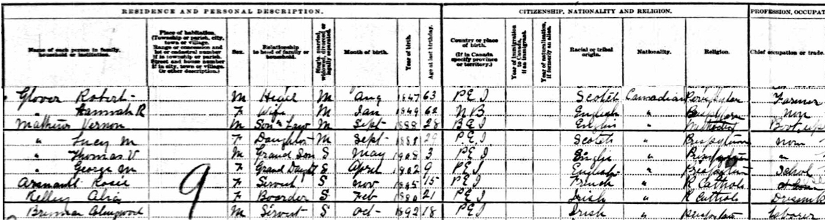 | Census | He was head of the household in the census in 1911 in Summerside, Prince County, Prince Edward Island, CanadaG. *Note: Thomas reported his given name incorrectly as Robert, same as his father. Included in the household with Thomas (age 63) his wife Hannah (age 62), their daughter Lucy (age 29), her husband Vernon Matthew (age 28), their children Thomas (age 3) and Georgie (age 9). There were also three unrelated boarders. Thomas was a farmer, Vernon was a boot salesman in a general store, Georgie was in school. The family religion was Presbyterian, except for Vernon, who was Methodist.5 1911 Canada Census, Summerside, Prince County, Prince Edward Island. Household of Thomas Glover, his wife Hannah, their daughter Lucy, her husband Vernon Matthew, their children Thomas and Georgie. There were also three unrelated boarders. |