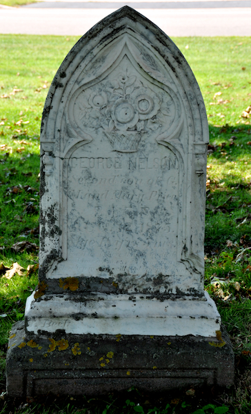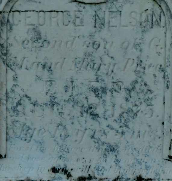 | Burial | He was buried in the Peoples Cemetery, Summerside, Prince County, Prince Edward Island, Canada, 46.40563, -63.77741G. his stone is to the right of his parents. Inscription: George Nelson / Second son of G. / M. and Mary Price / Died / Aug. 12, 1875. / Age 18 Y'rs 5ms. / [script].3 Tombstone, George Nelson Price (1856-1875). Peoples Cemetery, Summerside, Prince County, Prince Edward Island, Canada.  Front inscription detail. |