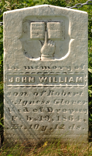 | Burial | He was buried in North Bedeque Cemetery, North Bedeque, Prince County, Prince Edward Island, Canada, 46.36211, -63.72588G. white ballast stone. Inscription: In memory of / John William / son of Robert / & Agnes Glover / died of Dropsey / Feb. 19, 1864, / AEt. 10 y, 12 ds. / [script].2 Tombstone, John William Glover (1854-1864)North Bedeque Cemetery, Prince County, Prince Edward Island, Canada. |