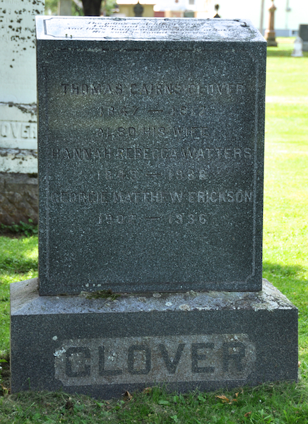 | Burial | He was buried in the Peoples Cemetery, Summerside, Prince County, Prince Edward Island, Canada, 46.40577, -63.77684G. Inscription: Thomas Cairns Glover / 1847 - 1912 / Also His Wife / Hannah Rebecca Watters / 1849 - 1938 / Georgie Matthew Erickson / 1902 - 1936.1 Tombstone, Thomas Cairns Glover (1847-1912), his wife Hannah Rebecca Watters (1849-1938), and Georgie Matthew Erickson (1902-1936). Peoples Cemetery, Summerside, Prince County, Prince Edward Island, Canada. |