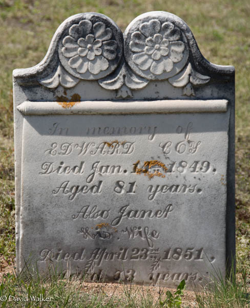 | Principal 2 | She witnessed the burial of Edward Coy, Jr., and Jannet A. Murray in the Baptist Cemetery, Upper Gagetown, Queens County, New Brunswick, Canada, 45.84577, -66.24084G.4,2 Tombstone with footstone, Edward Coy Jr. (1768-1849), his wife Janet Murray (1778-1851). Baptist Cemetery, Upper Gagetown, Queens County, New Brunswick, Canada.  Tombstone, Edward Coy Jr. (1768-1849), his wife Jane Murray (1778-1851). Baptist Cemetery, Upper Gagetown, Queens County, New Brunswick, Canada. |