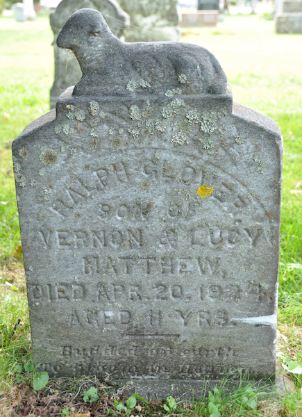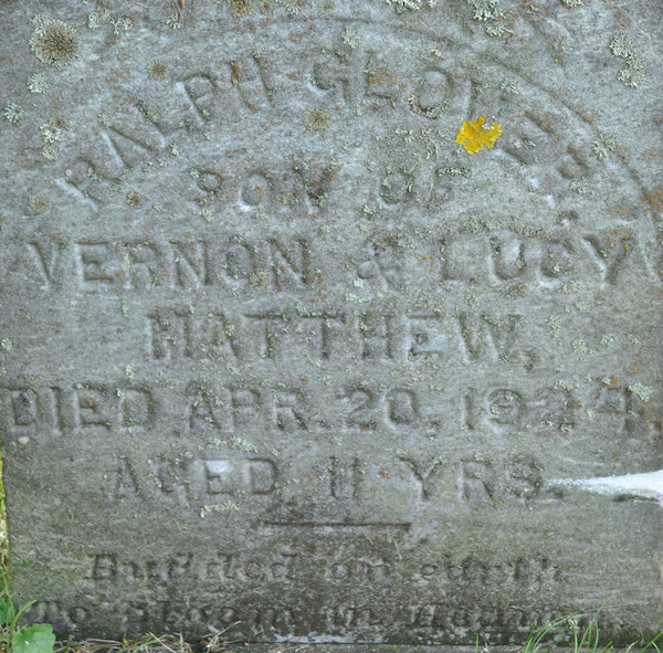 | Burial | He was buried in the Peoples Cemetery, Summerside, Prince County, Prince Edward Island, Canada, 46.40575, -63.77683G. Inscription: Ralph Glover / son of / Vernon & Lucy / Matthew / Died Apr. 20, 1924 / Aged 11 yrs. / Budded on earth / To bloom in Heaven.2 Tombstone, Ralph Glover Matthew (1913-1924). Peoples Cemetery, Summerside, Prince County, Prince Edward Island, Canada.  Front inscription detail. |