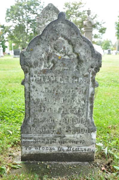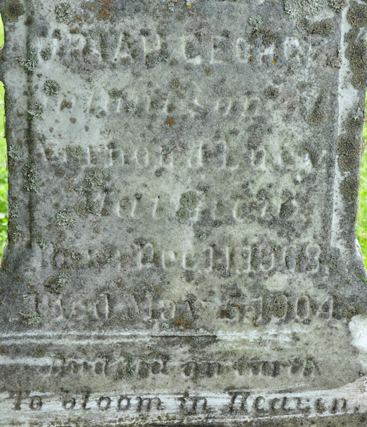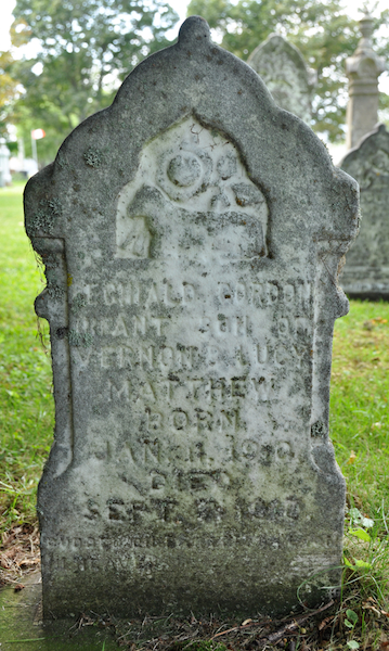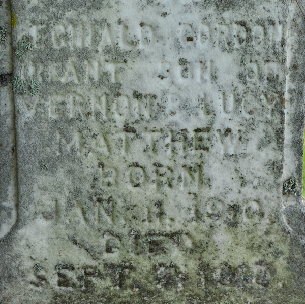 | Burial | He was buried in the Peoples Cemetery, Summerside, Prince County, Prince Edward Island, Canada, 46.40572, -63.77689G. Inscription: Uriah George / Infant son of / Vernon & Lucy / MAtthew / Born Dec. 11, 1903 / Died May 5, 1904. / Budded on earth / To bloom in Heaven.2 Tombstone, Uriah George Matthew (1903-1904). Peoples Cemetery, Summerside, Prince County, Prince Edward Island, Canada.  Front inscription detail. |