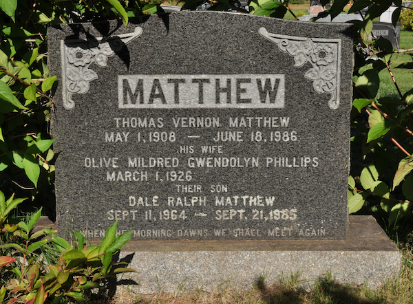 Inscription: MATTHEW / Thomas Vernon Matthew / May 1, 1908 - June 18, 1986 / His Wife / Olive Mildred Gwendolyn Phillips / March 1, 1926 - 15 Jan. 2011 / Their son / Dale Ralph Matthew / Sept. 11, 1964 - Sept. 21, 1985. / When the morning dawns we shall meet again.3  Tombstone, Thomas Vernon Matthew (1908-1986), his wife Olive Mildred Gwendolyn Phillips (1926- ), their son Dale Ralph Matthew (1964-1985). People's Cemetery, Summerside, Prince County, Prince Edward Island, Canada.
