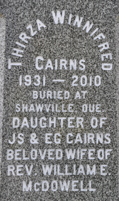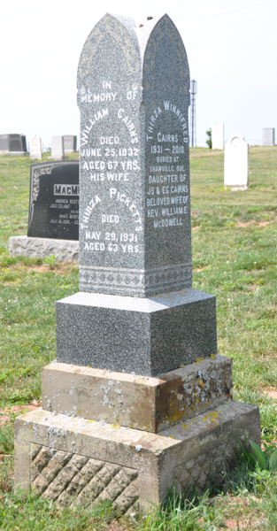 | Interred | She was buried in the plot of Benjamin Darby Cairns, in the Peoples Cemetery, Summerside, Prince County, Prince Edward Island, Canada, 46.40577, -63.77655G.