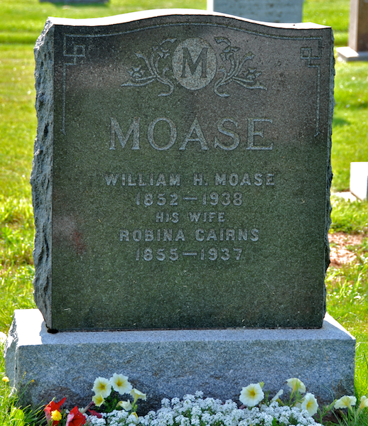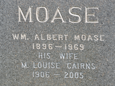 | Burial | He was buried in the Peoples Cemetery, Kensington, Prince County, Prince Edward Island, Canada, 46.44763, -63.62892G. Inscription: MOASE / William H. Moase / 1852 - 1938 / His Wife / Robina Cairns / 1855 - 1937 / Back: Wm. Albert Moase / 1896 - 1969 / His Wife / M. Louise Cairns / 1906 - 2005.3 Tombstone, William Henry Moase (1852-1938), his wife Robina Cairns (1855-1937), their son William Albert Moase (1896-1969), his wife Mary Louise Cairns (1906-2005). The Peoples Cemetery, Kensington, Prince County, Prince Edward Island, Canada.  Back inscription detail. |
