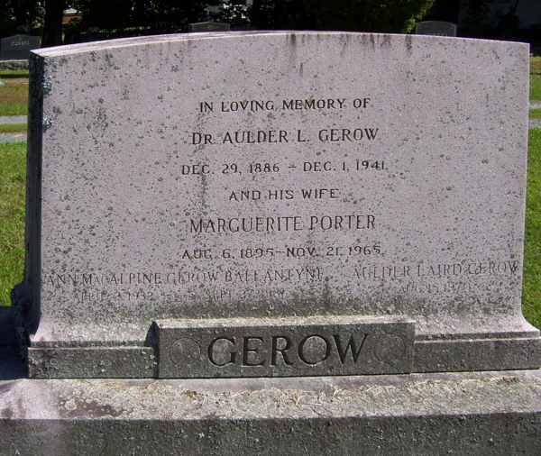 Inscription: In Loving Memory of / Dr. Aulder L. Gerow / Dec. 29, 1886 - Dec. 1, 1941 / And His Wife / Marguerite Porter / Aug. 6, 1895 - Nov. 21, 1965 / Ann MacAlpine Gerow / April 2, 1932 - Sept. 27, 1986 | Aulder Laird Gerow / Aug. 15, 1970.2  Tombstone, Dr. Aulder L. Gerow (1886-1941), his wife Marguerite Porter (1895-1965), their children, Ann MacAlpine Gerow (1932-1986) and Aulder Laird Gerow (?-1970). Fredericton Rural Cemetery, 395 Woodstock Rd., Fredericton, York County, New Brunswick, Canada. Photo courtesy of David L. Underhill (findagrave.com).