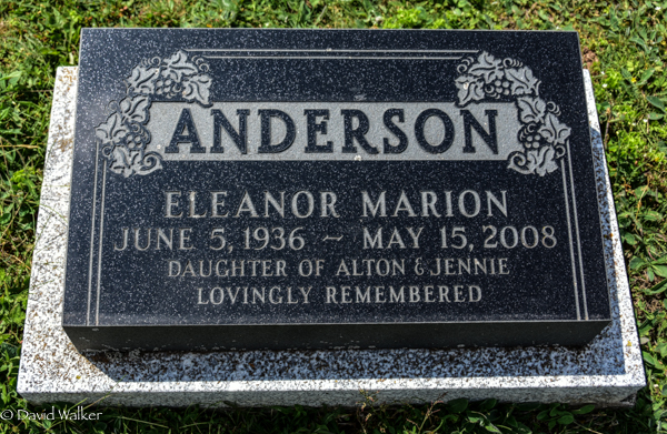 Inscription: ANDERSON / Eleanor Marion / June 5, 1936 - May 15, 2008 / Daughter of Alton & Jennie / Lovingly Remembered.3,2  Tombstone, Eleanor Marion Anderson (1936-2008). Presbyterian/United Cemetery, Midgell, Kings County, Prince Edward Island, Canada.