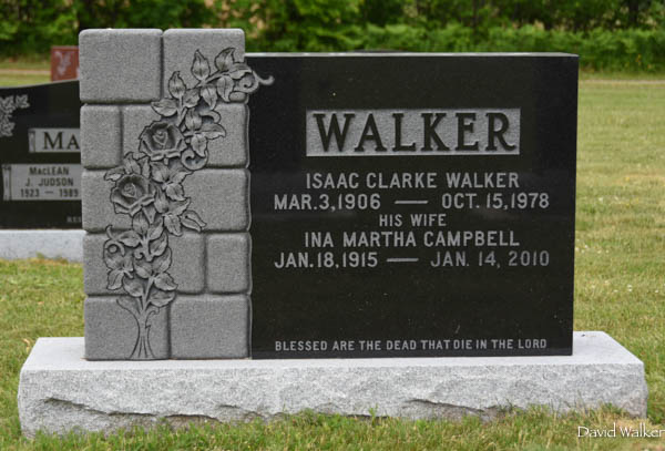 Combination carved stone base and polished black marble stone. Inscription: WALKER / Isaac Clarke Walker / Mar. 3, 1906 - Oct. 15, 1978 / His wife / Ina Martha Campbell / Jan. 18, 1915 - Jan. 14, 2010 / Blessed are those that die in the Lord.5  Tombstone, Isaac Clarke Walker (1906-1978) and his wife Ina Martha Campbell (1915-2010). Peoples Cemetery, Kensington, Prince County, Prince Edward Island.