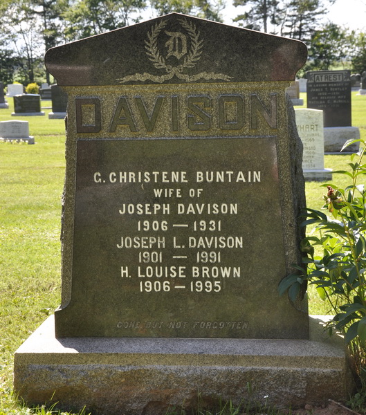 Inscription: DAVISON / G. Christene Buntain / Wife of / Joseph Davison / 1906 - 1931 / Joseph L. Davison / 1901 - 1991 / H. Louise Brown / 1906 - 1995.2,6  Tombstone, Joseph L. Davison (1901-1991), his first wife G. Christene Buntain (1906-1931), his second wife H. Louise Brown (1906-1995). Peoples Cemetery, Kensington, Prince County, Prince Edward Island, Canada.