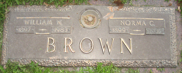 Inscription: William W. / 1897 - 1983 | Norma C. / 1899 - 1985 // BROWN.8  Cemetery marker, William W. Brown (1897-1983), his wife, Norma C. Murchison (1899-1985). Floral Hills Memorial Gardens, Pleasant Valley, Queens County, Prince Edward Island, Canada. Photo courtesy of peiancestry.com