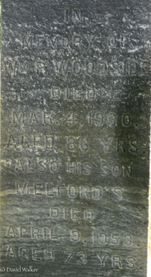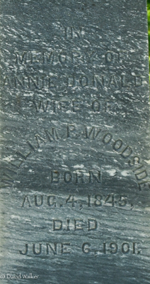 Inscription: In / Memory of / Annie Donald / Wife of / William P. Woodside / Born / Aug. 4, 1845, / Died June 6, 1901.Left: In / Memory of / Elizabeth A. Taylor / Wife of / Wm. P. Woodside / Died / Sept. 23, 1927, / Aged 65 yrs.Right: In / Memory of / Wm. P. Woodside / Died / Mar. 4, 1930, / Aged 86 yr's / Also His Son / Melford S. / Died / April 9, 1953, / Aged 73 yrs.3,2  Cemetery marker, William Pickering Woodside (1844-1930), his first wife Annie Donald (1845-1901), his second wife Elizabeth A. Taylor (1862-1927), Melford S. Woodside (1879-1953), son of William and Annie. Peoples Cemetery, Malpeque, Prince County, Prince Edward Island, Canada.  Front inscription detail.  Left inscription detail.  Right inscription detail.