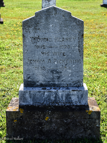 - [S14531] Cemetery marker, United Church Cemetery, Margate, Prince County, Prince Edward Island, Canada. Thomas Heaney & Jemima Pickering, tombstone inscription & photograph; documented by David A. Walker, 31 August 2019.