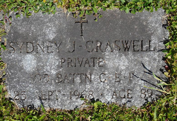 Inscription Front: Sydney J. Craswell / Private / NB Battn C.E.F. / 25 Sept. 1968 - Age 89.4  Marker, Sydney Jewell Craswell (1878-1968). Elmwood Cemetery, Moncton, Westmorland County, New Brunswick, Canada. Photo courtesy of Jane Wood (findagrave.com).