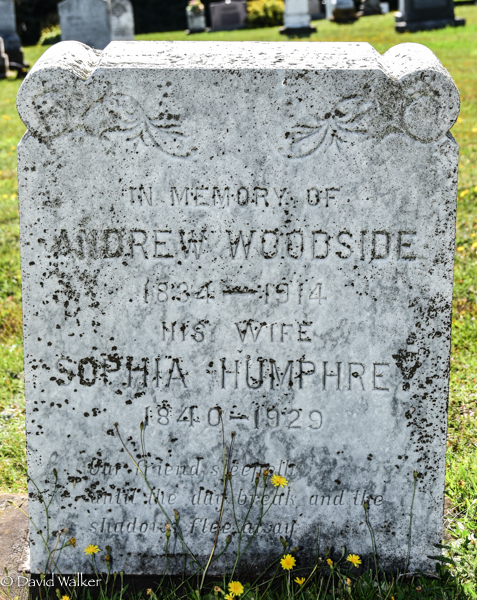 Inscription: In Memory of / Andrew Woodside / 1834 - 1914 / His Wife / Sophia Humphrey / 1840 - 1929.1,2  Cemetery Marker: Andrew Woodside, (1834-1914), his wife Sophia Humphrey (1840-1929). United Church Cemetery, Margate, Prince County, Prince Edward Island, Canada.