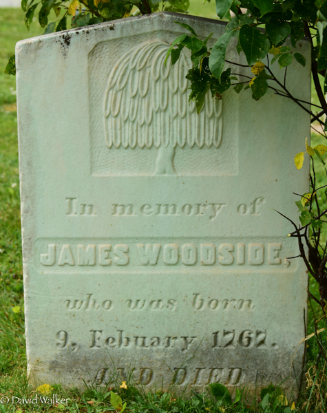 Inscription: In memory of / James Woodside. / who was born 9, Febuary 1767. / And Died / [rest below ground].2  Tombstone, James Woodside (1767-1857). Peoples Cemetery, Malpeque, Prince County, Prince Edward Island, Canada.