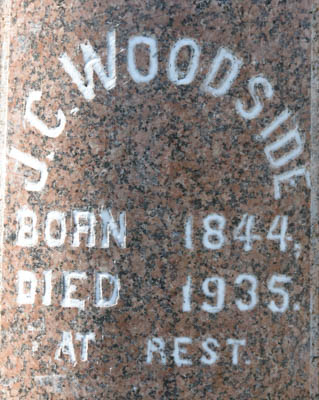 Inscription: William Woodside / Died / July 4, 1899, / ÆT. 83. / And His Wife / Sarah E. Wood / Died / Mar. 19, 1866, / ÆT. 55. / He giveth his / beloved sleep. / WOODSIDERight: J.C. Woodside / Born 1844, / Died 1935. / At Rest.1  Tombstone, William E. Woodside (1816-1899), his wife Sarah E. Wood (1811-1866), their son Charles (1844-1935). United Church Cemetery, Margate, Prince County, Prince Edward Island, Canada.  Front inscription detail.  Right inscription detail.