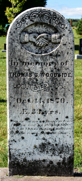 Inscription: In memory of / Thomas C. Woodside / Died / Oct. 14, 1870, / Æ. 23 yr's.1,2  Cemetery Marker: Thomas C. Woodside (1847-1870). Peoples (Protestant) Cemetery, New London, Queens County, Prince Edward Island, Canada.