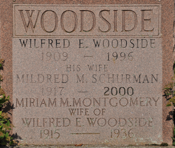 Inscription: SCHURMAN / Walter S. Schurman / 1888 - 1956 / His Wife / Carrie M. Gamble / 1887 - 1974 / Their son / Kenneth W. / 1913 - 1938 Back: WOODSIDE / Wilfred E. Woodside / 1909 - 1996 / His Wife / Mildred M. Schurman / 1917 - 2000 / Miriam M. Montgomery / Wife of / Wilfrid E. Woodside / 1915 - 1936.3  Tombstone, Walter Scott Schurman (1888-1956), his wife Caroline Martha Gamble (1887-1974), their son Kenneth William Schurman (1913-1938), their daughter Mildred Minetta Schurman (1917-2000), her husband Wilfred Edward Woodside (1909-1996), his first wife Miriam M. Montgomery (1915-1936). Peoples Cemetery, Summerside, Prince County, Prince Edward Island, Canada.  Back inscription detail.