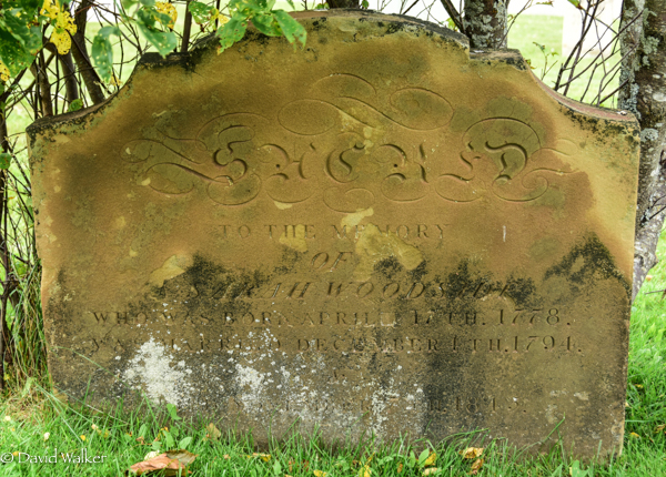 Inscription: Sacred / to the memory of / Sarah Woodside / who was born April 17th, 1778, / was married December 4th, 1794. / & / died November 7th 1845.1  Tombstone, Sarah (Murchland) Woodside (1778-1845). Peoples Cemetery, Malpeque, Prince County, Prince Edward Island, Canada.