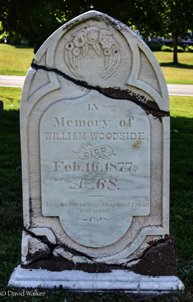 | Burial | He was buried in Princetown Cemetery, Malpeque, Prince County, Prince Edward Island, Canada, 46.52983, -63.68781G. Inscription: In / Memory of / William Woodside / Died / Feb. 16, 1877, / A. 68.2 Tombstone, William Woodside (1809-1877). Peoples Cemetery, Malpeque, Prince County, Prince Edward Island, Canada. |