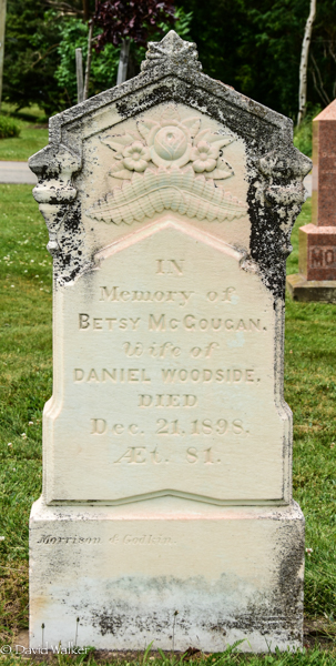 Inscription: In / memory of / Betsy McGougan, / Wife of / Daniel Woodside, / Died / Dec. 21, 1898, / Æt. 81.1,2  Tombstone, Betsy (McGougan) Woodside (1817-1898). Peoples Cemetery, Malpeque, Prince County, Prince Edward Island, Canada.